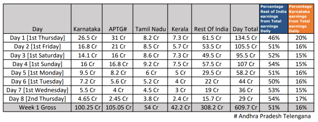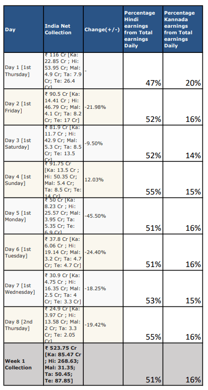 The chart below shows – Percentage of daily earnings from the Rest of India and Kannada. Also, after three days, collections from the south show precipitous drop.